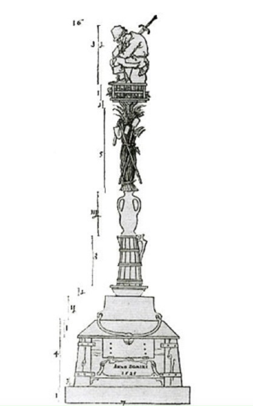 In 1525 Albrecht Durer proposed a monument to commemorate and the numerous peasant revolts that were occurring throughout the German countryside. Durer’s proposal for a monument to the peasant revolt was never realized. The only drawings that exist of Durer’s unrealized monument depict a victory column comprised of farm related items with a peasant sitting atop of it stabbed by a sword piercing his back.
