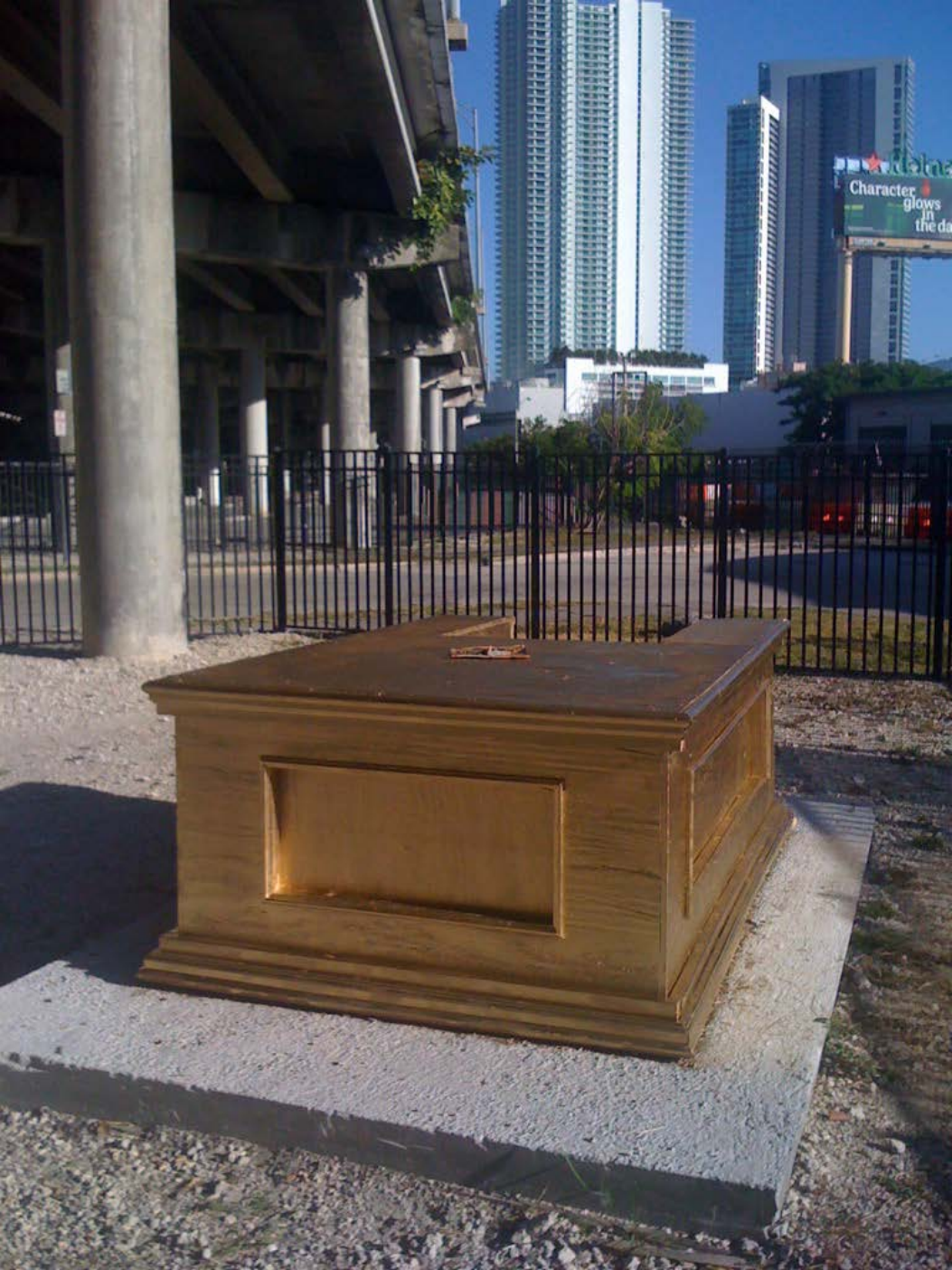 The Wishing Well was displayed in the neighborhood surrounding the artist’s studio in downtown Miami in 2006. The Flagler railroad tracks distinguished the East and West side of downtown Miami personifying the metaphor of “Living on the other side of the Tracks”. Overtown and downtown Miami is undergoing a transformation since Interstate 395 is being reconstructed and the rail road is being used to connect Miami to Fort Lauderdale, Boca Raton and Orlando.