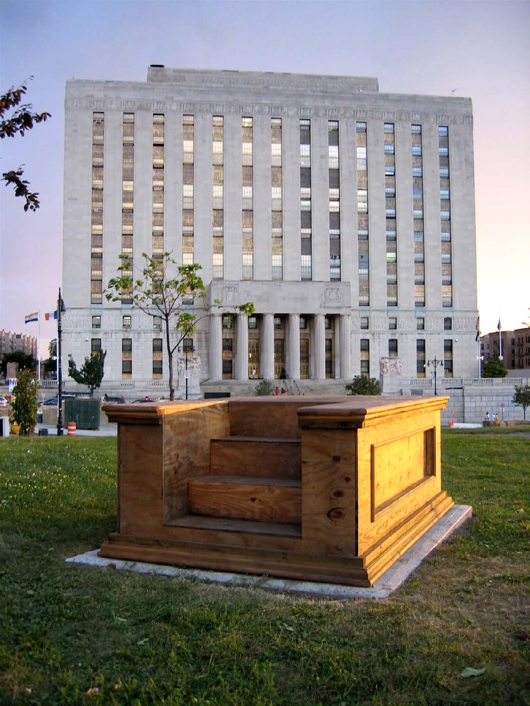 Monument / Plinth / Stoop involved the recreation of the plinth with a set of steps leading to the top of it. The individual who chose to rise to the top became part of a sculptural work of art. Cities are adorned with “monuments” but this one embraces the individual, the person that is often over-looked. Individuals walking by would occasionally rest on the steps of the plinth, thus, transforming it into a stoop.