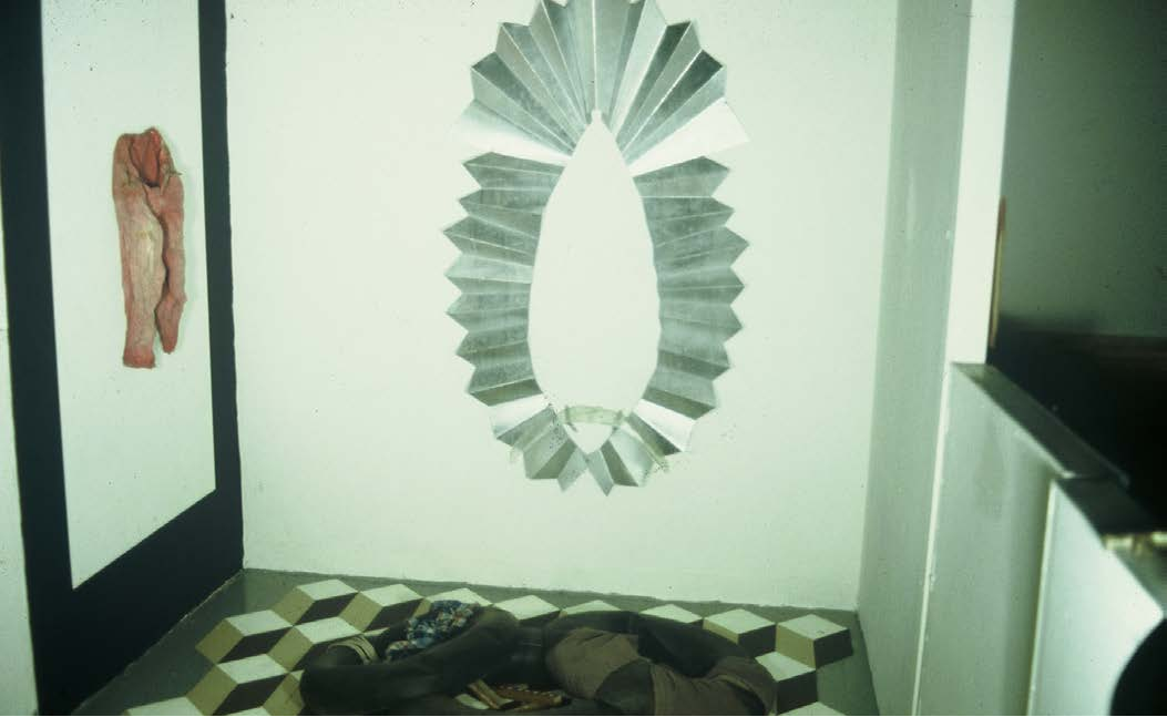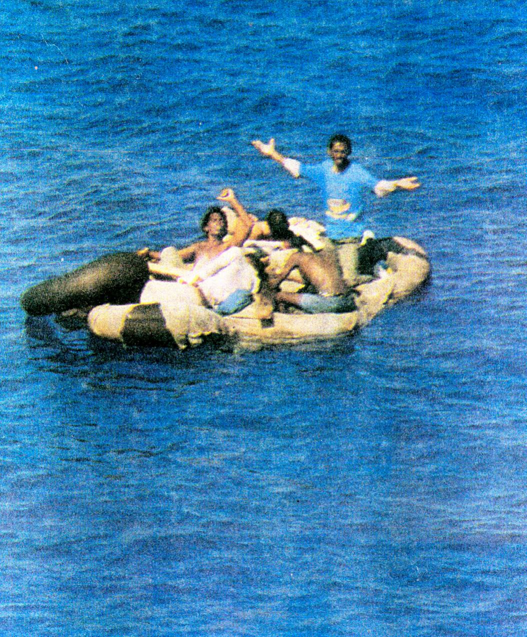 Three rafts found out at sea which belonged to Cuban Rafters, cast glass crescent moon, wood and steel.